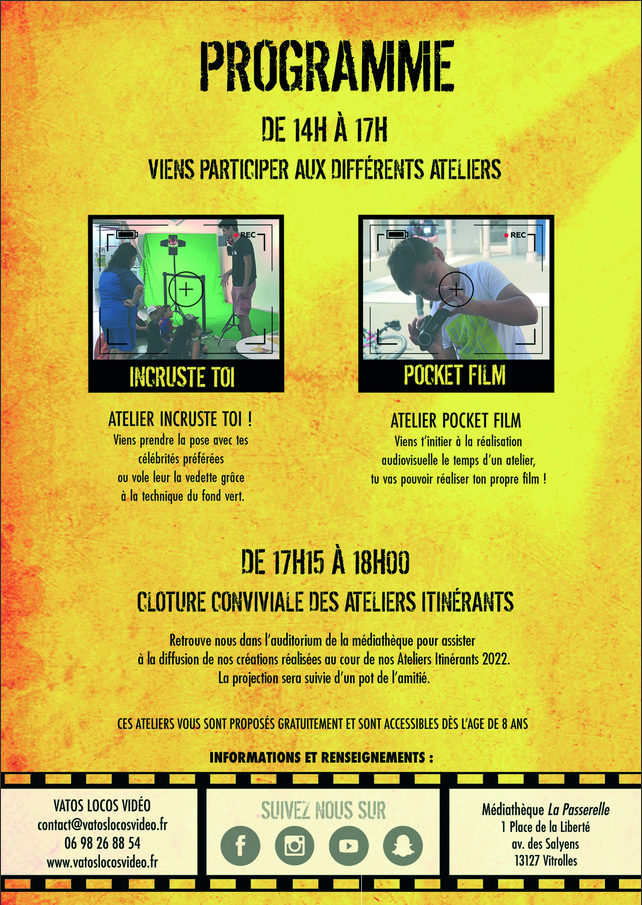 Du 15 juin 2022 au 15 juin 2022 Ateliers d'initiation au cinéma ANIMATIONS Vitrolles Partager sur Facebook Partager sur Twitter Partager par mail Ateliers d'initiation au cinéma mercredi 15 juin de 14h à 17h Et à 17h15, clôture conviviale des ateliers itinérants ! Ateliers gratuits à partir de 8 ans.