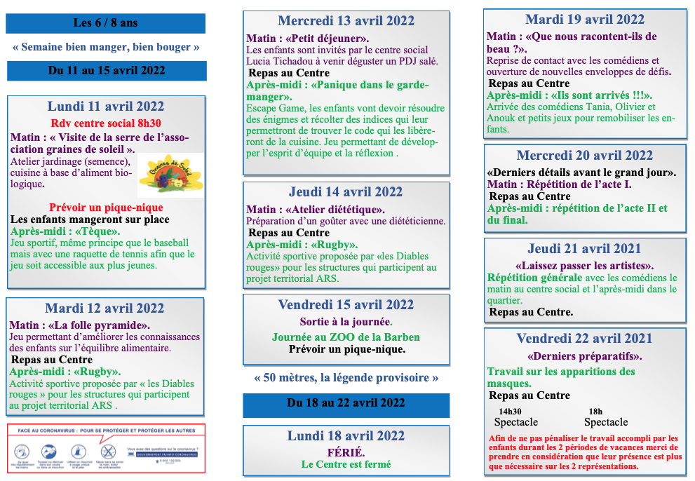 Du 11 avril 2022 au 29 avril 2022 Le programme d’activités des vacances pour les 6-8 ans au centre social Nelson Mandela INFOS Port de Bouc Partager sur Facebook Partager sur Twitter Partager par mail
