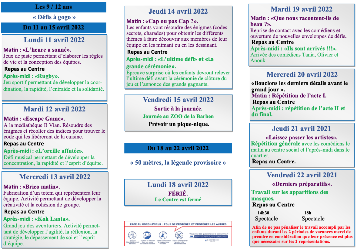 Du 11 avril 2022 au 22 avril 2022 Le programme d’activités des vacances pour les 9-12 ans au centre social Nelson Mandela INFOS Port de Bouc Partager sur Facebook Partager sur Twitter Partager par mail