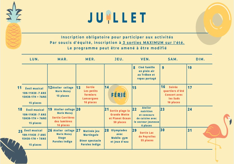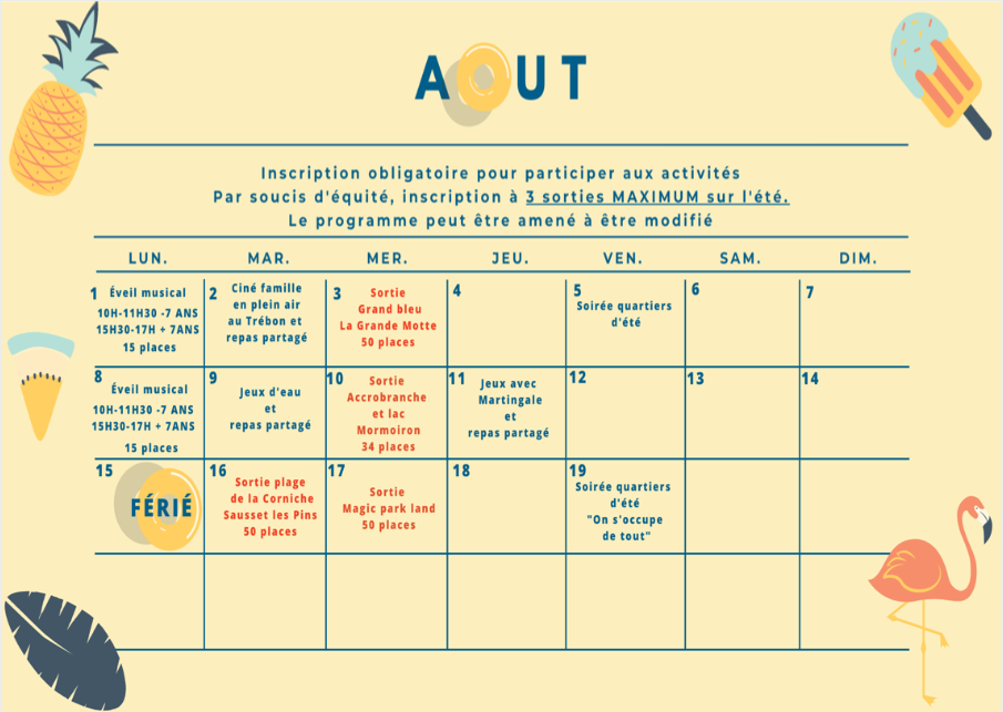 Du 1 juin 2022 au 31 août 2022 Programme famille de l'été au centre social Mas Clairanne. INFOS Arles Partager sur Facebook Partager sur Twitter Partager par mail Informations et dates d'inscription : Retrouvez tout le programme de l'été au centre social Mas Clairanne : Juillet Août