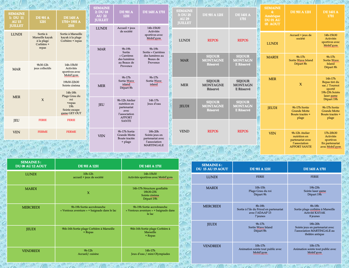 Du 11 juillet 2022 au 19 août 2022 Programme vacances secteur Jeunes Mas Clairanne INFOS Arles Partager sur Facebook Partager sur Twitter Partager par mail Le programme des vacances secteur Jeunes à Mas Clairanne est disponible :